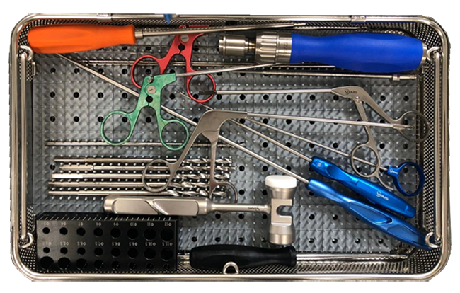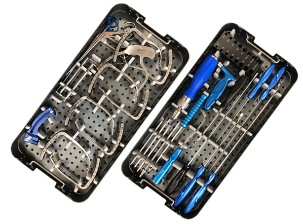 clever hook left& right, sliding suture cutter, combo grasper, suture manipulator grasper, knot pusher, switching stick, mallet, and automatic suture passer.