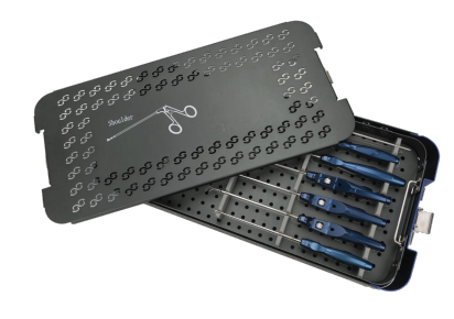 A complete instrumentation set including the specific glenoid and coracoid guide, drills, subscapularis spreader, osteotome, suture tensioner, suture cutter, grasper.